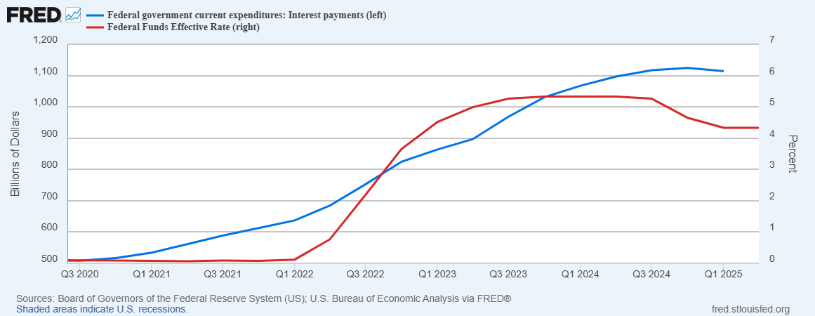 The impact on US Treasuries, the Notes, Bonds, and Bills that make up most of our country's borrowings, has been substantial. Had the Fed maintained rates at the Q1 2022 level, we would be saving roughly one-third of our interest expense over these last three years.